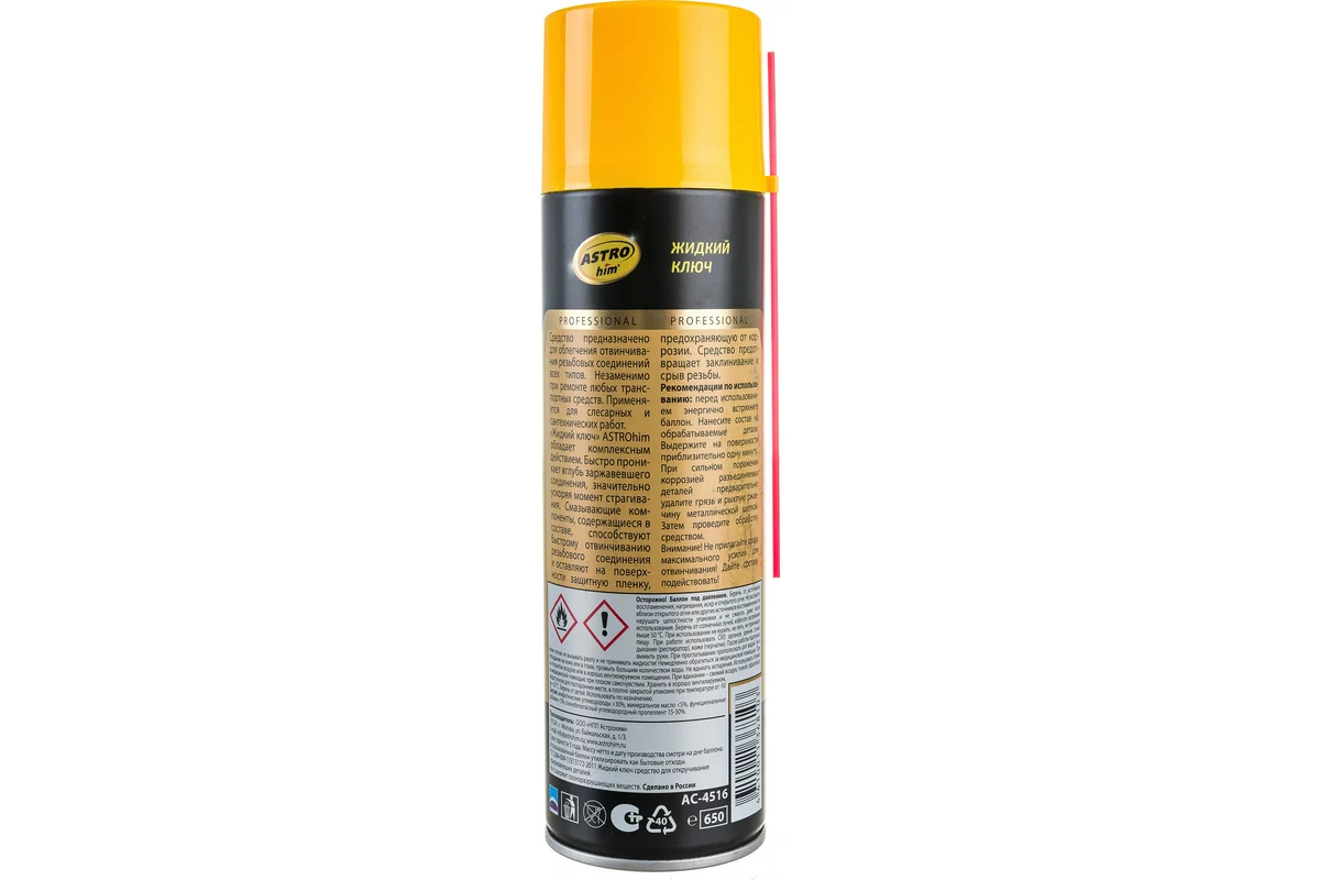 Жидкий ключ ASTROhim® предназначен для облегчения отвинчивания резьбовых соединений всех типов. Незаменим при ремонте любых транспортных средств, применяется для сантехнических и слесарных работ. Специальные компоненты препарата быстро проникают внутрь ржавчины, растворяют её и возвращают подвижность резьбовым соединениям, петлям и замкам. Предотвращает заклинивание и срыв резьбы. Образует на поверхности смазывающую пленку. Предохраняет от коррозии, устраняет неприятные скрипы соединений. Аэрозольная форма выпуска и прилагаемая удлинительная трубочка позволяют использовать состав для обработки труднодоступных мест. Способ применения: Перед использованием энергично встряхните баллон в течение 1-2 мин. С расстояния 20-30 см распылите состав на обрабатываемые детали. Выдержите на поверхности 5-10 мин. Внимание! Не прилагайте сразу максимального усилия для отвинчивания! Дайте составу подействовать!