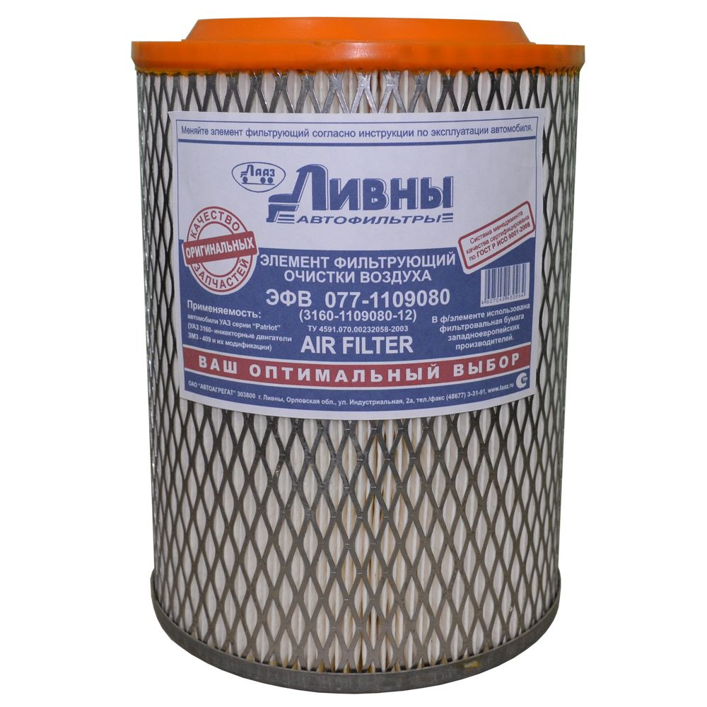 Элемент фильтрующий воздушный, УАЗ Патриот, Пикап, ПРОФИ, ЗМЗ 409, ЗМЗ 405, ЭФВ 077-1109080, ЛИВНЫ